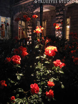 入り口近くの洋館の横のスペースでは、バラにスポットライトが当てられて、ステージのようでした。