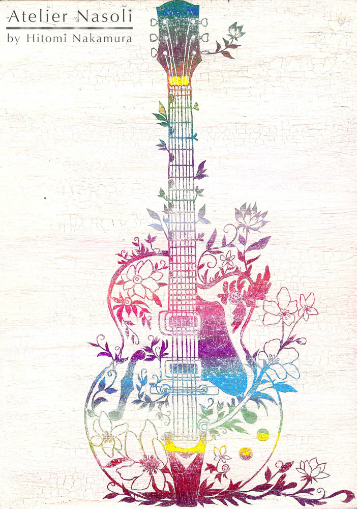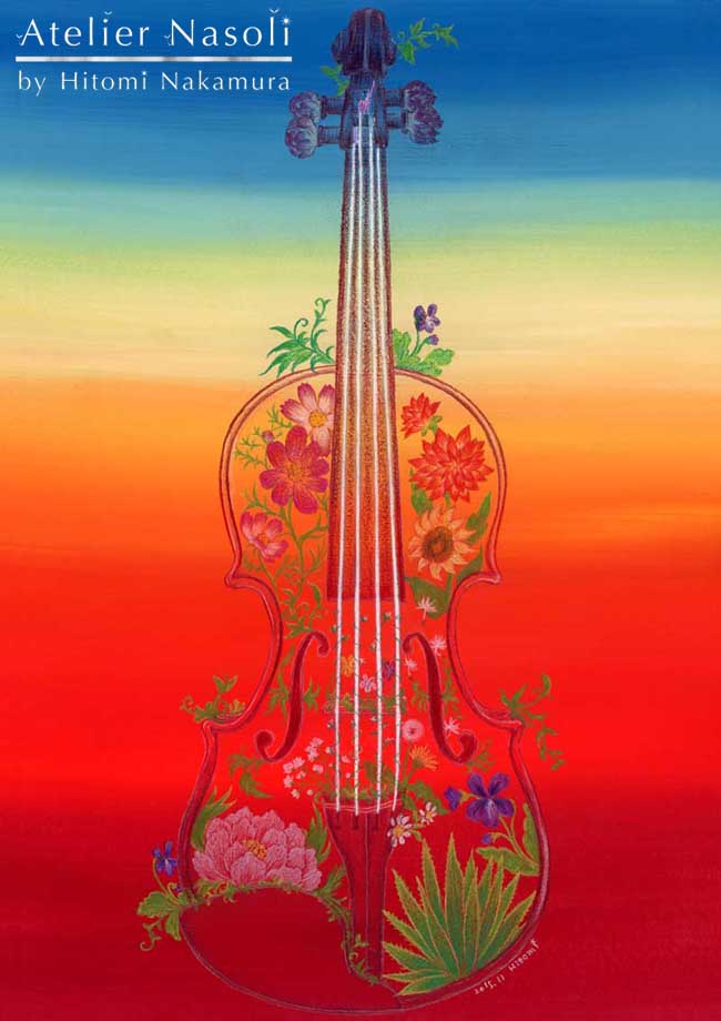当時「楽器に草花生えてたら面白い!」と思って描いた作品ですが、方々でご好評をいただき、結果ヴァイオリンver.が生まれ今に至っております。