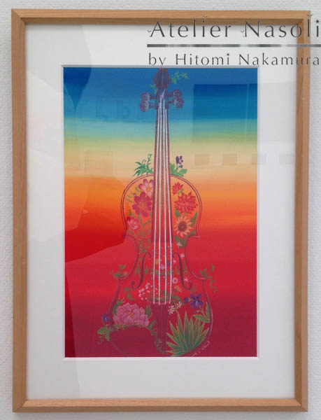上のバイオリンの絵をきっかけに注文をいただき、2015年秋に制作した絵「Hana-Violin"Red"」。こちらも今回初のお披露目です。赤からオレンジ、青へのグラデーションが目を引くと好評でした。注文いただいた方が実際に愛用しているバイオリンをモデルに描いています。