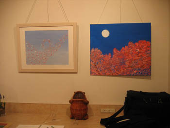 春らしい色彩がステキな作品でした。夜桜の絵は特に、鮮やかな色が目を引きました。名刺入れ代わりに使っていた、カエルのお香立てもかわいい!