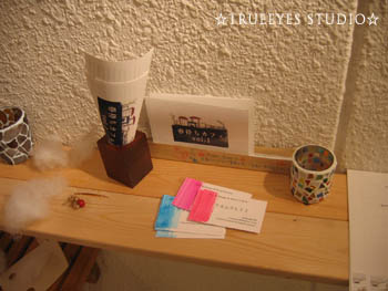 最終日、お客さんが途切れた隙を狙って、やっと撮れました!私の作品の展示風景です。(会場全体の風景は、ジョウのホームページで見られます。)