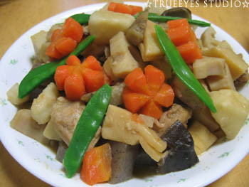 写真は来てくれたみんなにごちそうした、うちのお正月には欠かせない郷土料理「がめ煮」。去年母に教わった飾り切りの人参入り☆