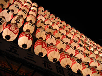 鳥居をくぐるとたくさんの屋台が並んでいます。品定めしながら進んで、境内に入ると、頭上にずらっと並んだ提灯。これも毎年お馴染みの光景です。夜空とのコントラストがとても素敵!