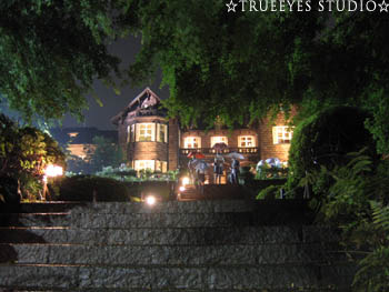 橋を渡って引き返して来ると、石段の向こうに洋館が望めます。こんな洋館に住んでみたい!
