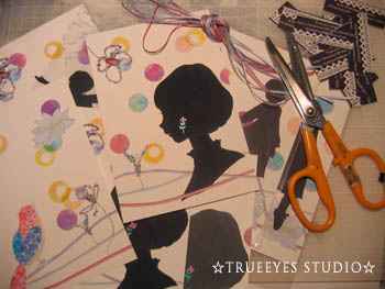 そういえば、この切り絵をつくっている最中に、幼稚園の頃から愛用してきたお気に入りのはさみの柄が壊れました(;_;)プラスチックの柄が、付け根からだんだんぐにゃ〜っと曲がってきて、最後に刃を残してボロっと取れた様子が衝撃的でした。瞬間接着剤で一命は取り留めましたが・・そろそろ隠居させようかと思います。。
