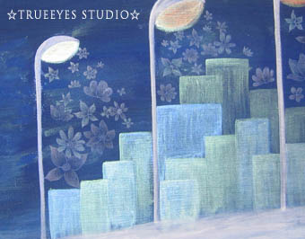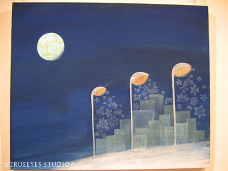 街の部分と月の部分は、パール入りの絵の具を使っているので、照明の角度によってギラリと光ります。