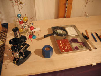 ここは博士の机。この顕微鏡では、謎の植物の花粉と花びらの組織が見られます。ぜひのぞいてみてください!びっくりしますよ〜(^^)