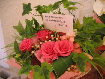 今日はお花の他にも、故郷の妹から手作りパウンドケーキが届いたり、タンバリンちゃん&mioちゃんから美味しいケーキを頂いたりして、(いつもほんとにありがとうね!)ちょっと豪華になりました。パウンドケーキはあと三本あるので、週末まではもつかな?という感じです。なかなか美味しいと好評でした。会場にいらっしゃったら、ぜひ召し上がって下さい☆