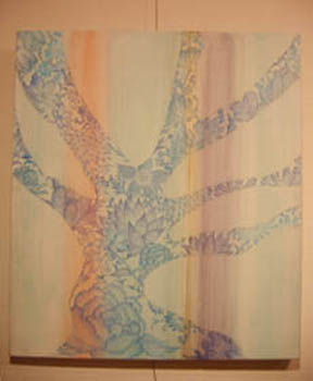 「花が咲く前の桜の木の中は、全部桜色に染まっている」というような話を聞いたことがあって、その話からインスピレーションを得て描きました。背景のストライプはアクリル、花(枝)の部分は色鉛筆です。
