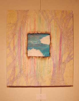 この作品はモデリングペーストという素材で画面をザラザラ&でこぼこにしてからアクリルで色を付け、不思議なテクスチャーにしました。キャンバスの中央を切り取って切り口を焦がしてあります。切り取った部分には、裏から空の絵や鬱屈とした感じの英語の詩を書いたビニールを貼ったり、いろいろやってます。