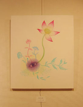 目から花が生えているように見えますが、本当の所はわかりません。「目」というパーツを見た時、その形とか、人に訴えかけるパワーを持っている点がすごく面白いと思いました。それがこの絵の発端です。画材はアクリルを少しと、大部分は水彩色鉛筆です。