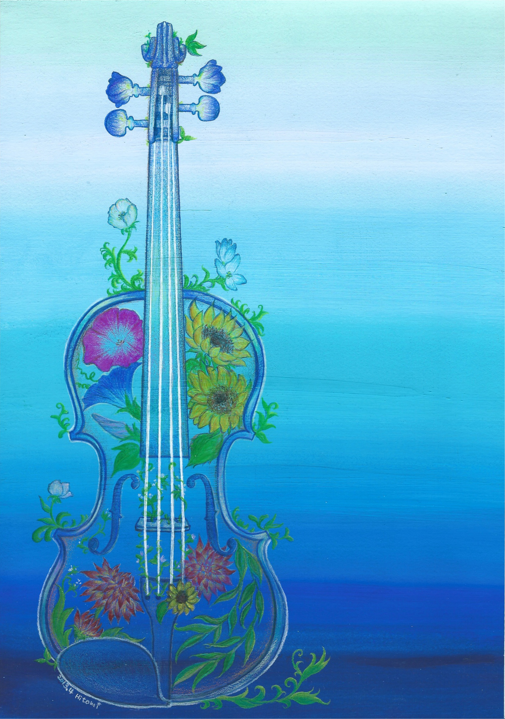 tail5周年ライブの時に描いた「Hana-Gretch」をとても気に入ってくれていたのでその絵を下敷きに、今回は色鉛筆でヴァイオリンと涼しげな青色、夏の花と植物をあしらった絵を・・との注文でした。