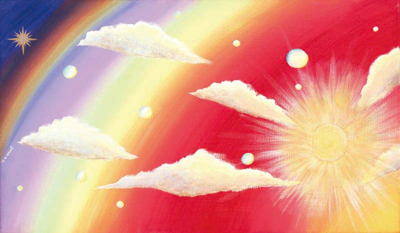 ジャケットの表面に来る画面右側には、雨上がりの夕方に輝く太陽を、裏面になる左側には夕暮れの後に続く虹と夜空の一番星を描きました。